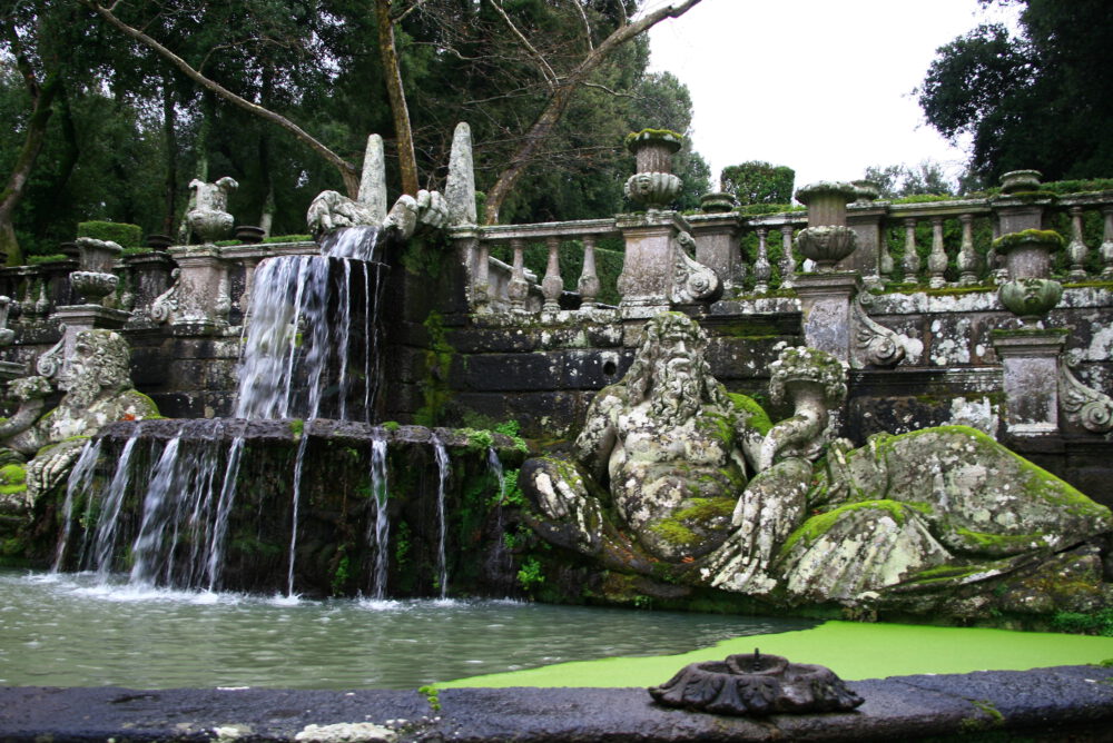 L’acqua nasce da un trionfo di geometrie disegnate da siepi sempreverdi e statue di peperino e segue un percorso che crea bacini e giochi d’acqua particolari.